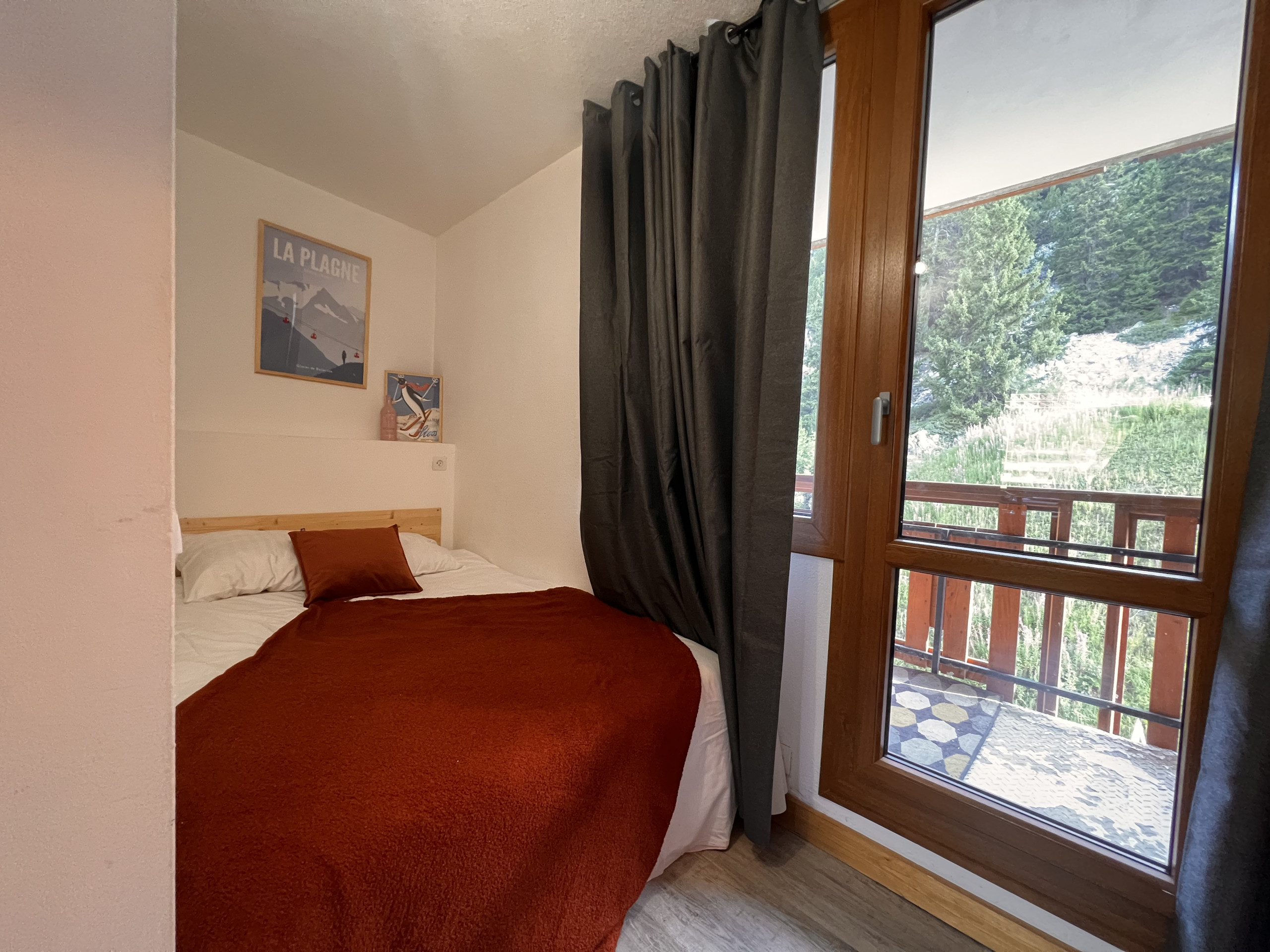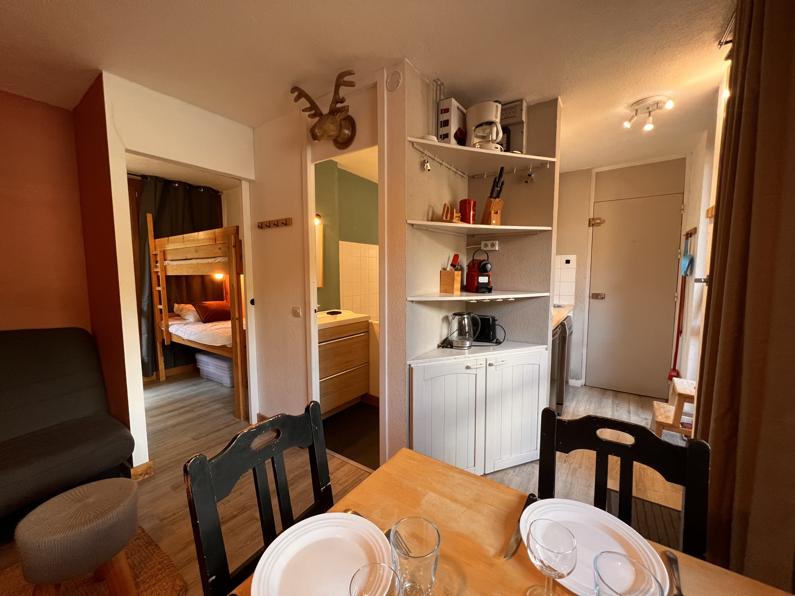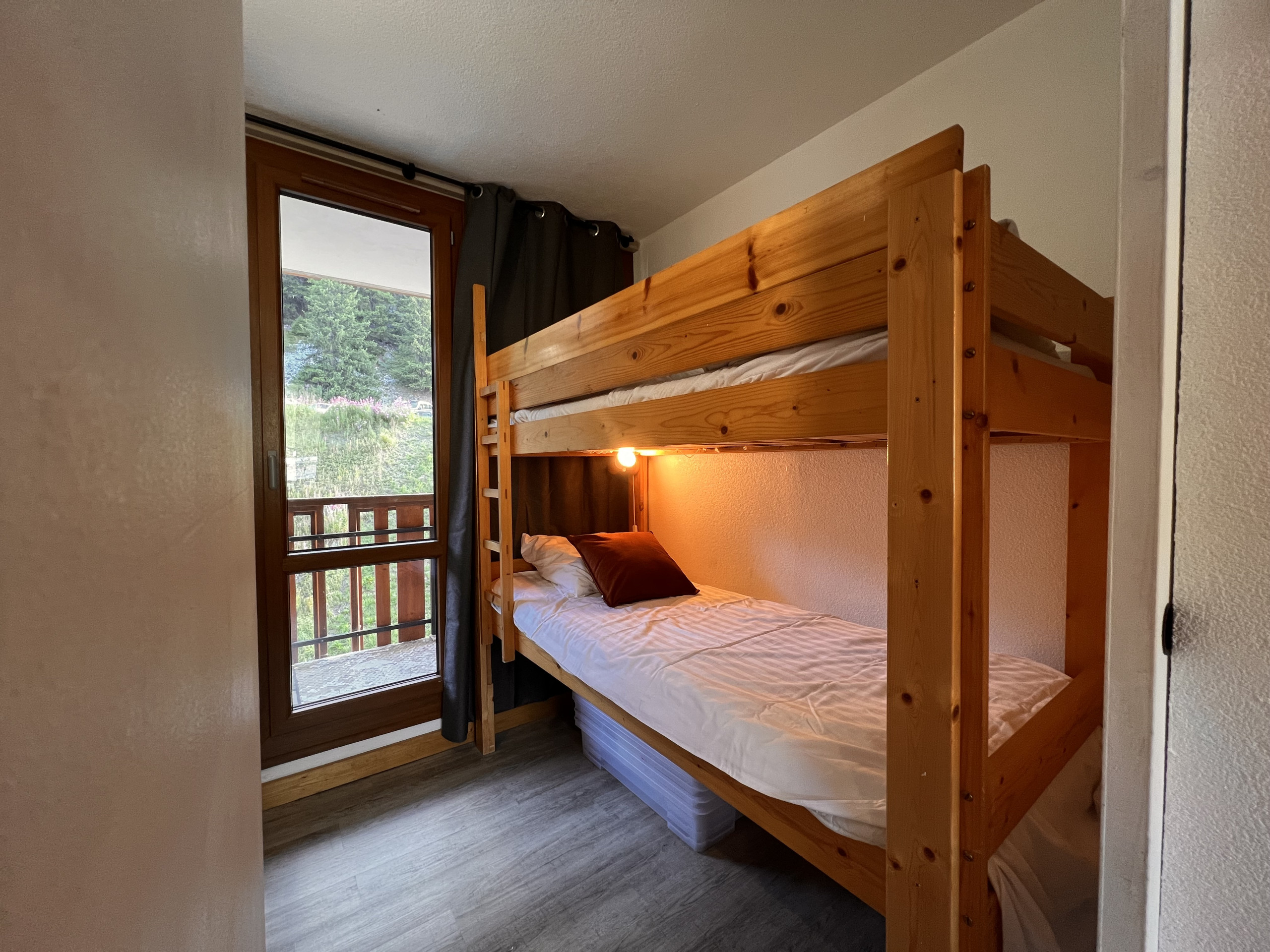 - Une chambre avec lit double (140X190), séparée d'un rideau lits superposés de (90X190) avec télévision