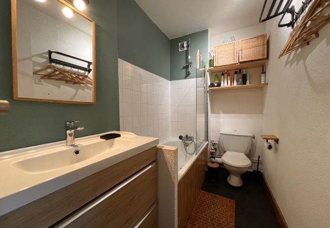 - Une salle de bain équipée d'une baignoire, un radiateur sèche-serviettes